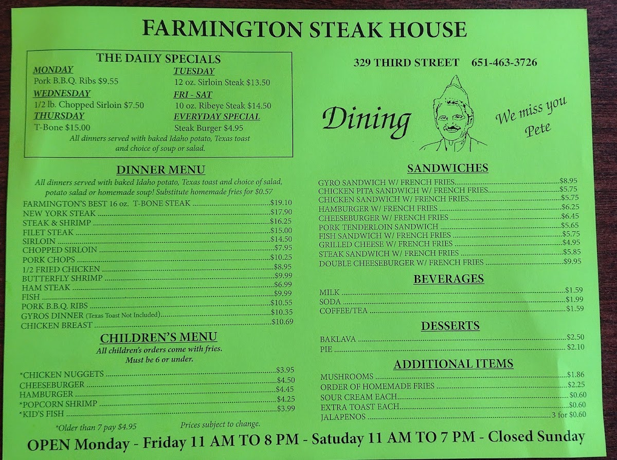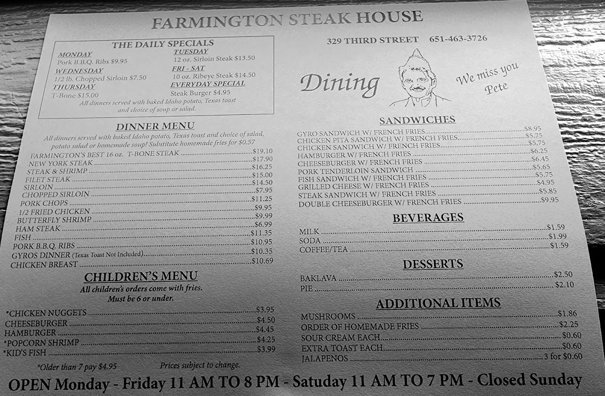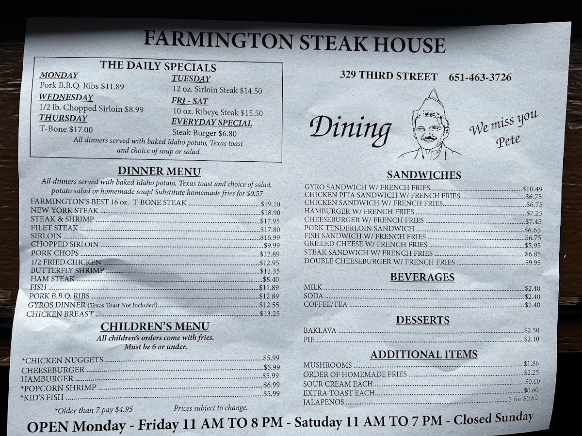 At Farmington Steak House, enjoy generously portioned dishes that highlight the establishment's reputation for serving up some of the best steaks in town. Notable mentions from their menu include the Farmington's Best 16 Oz. T-Bone Steak for $19.10, and the 10 Oz. Ribeye Steak featured in their Friday and Saturday specials for just $17.50. Add to this the enticing Steak & Shrimp combination or perhaps opt for a succulent New York Steak priced at $18.90, and your culinary journey is set. Kids can delight in options like Chicken Nuggets or Cheeseburgers, ensuring the whole family finds something to savor.